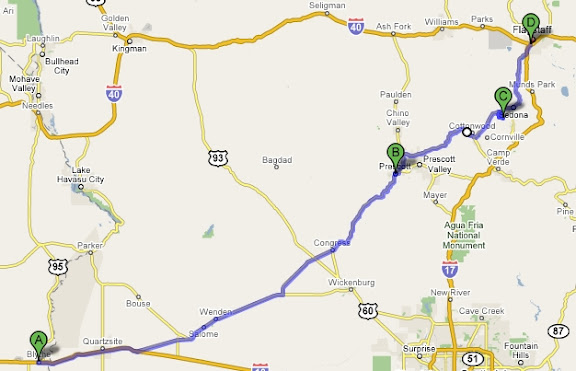 Vandaag zijn we na een heel bescheiden ontbijtje rond 8u vertrokken in Blythe. We zijn dan via Congress en Prescott naar Sedona gereden. Onderweg veranderde het landschap constant. Van Blythe naar Congress reden we langs een droge vlakte met cactussen en in de verte bergen. Eens voorbij Congress reden we echt de bergen in. De weg slingerde naar boven en terug naar beneden richting Prescott. In Prescott zijn we naar de Safe Mart gegaan om water in te slaan en een broodje te eten. We zijn ook nog een kijkje gaan nemen bij de Granite Dells. Dit zijn enorme granieten, rode rotsblokken. Na een kwartiertje foto's maken zijn we doorgereden.